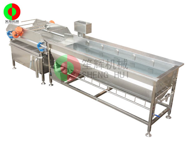 瓜果清洗機,采用氣泡清洗,有效分離被清洗物表面附著物,模擬人工清洗的基本動作并有效避免了人工清洗中的碰、撞、劃傷等現(xiàn)象。提高了工作效率,變?nèi)斯ぷ鳂I(yè)為自動化流水線加工。適用于各種新鮮蔬菜、腌漬菜、菌類、海產(chǎn)品、水果、藥材等物料的清洗去污。該機通過網(wǎng)帶流水線作業(yè),可配備蔬菜蒸煮機,殺青機,冷卻線,風(fēng)干線,速凍線等設(shè)備一起工作。
