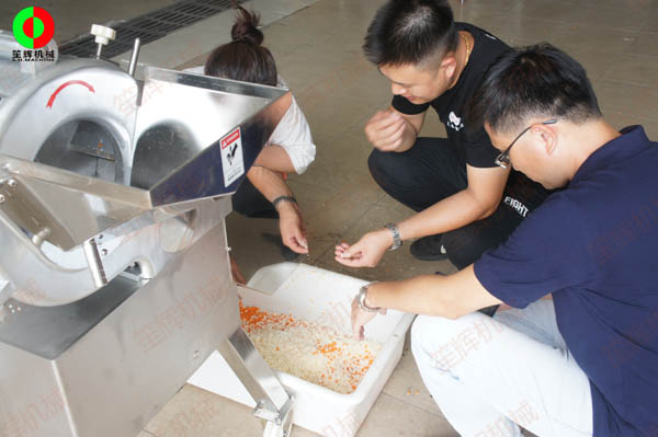 瓜果三維切丁機(jī)測(cè)試效果滿意,客戶付款購(gòu)買隨車運(yùn)走!
