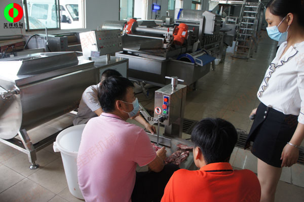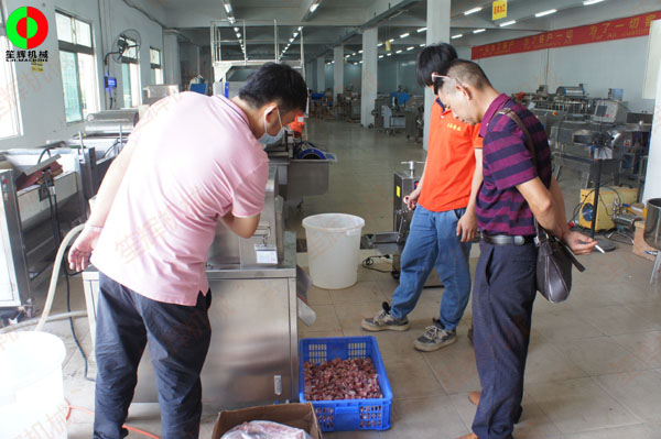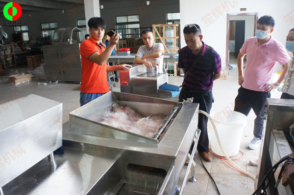 佛山某肉食品加工配送中心客戶一行人親臨我司測(cè)試訂購(gòu)洗排骨機(jī)等設(shè)備!