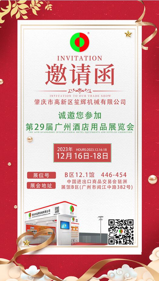 2023年第29屆廣州酒店用品展覽會,將于2023年12月16日-18日在中國進出口商品交易會琶洲展館(廣州市海珠區(qū)閱江中路380號)舉行,誠邀新老客戶屆時蒞臨我司展位參觀交流洽談!