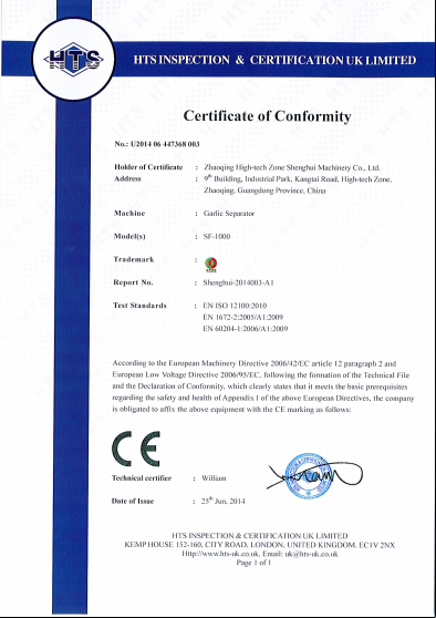 大蒜分瓣機獲得CE認(rèn)證